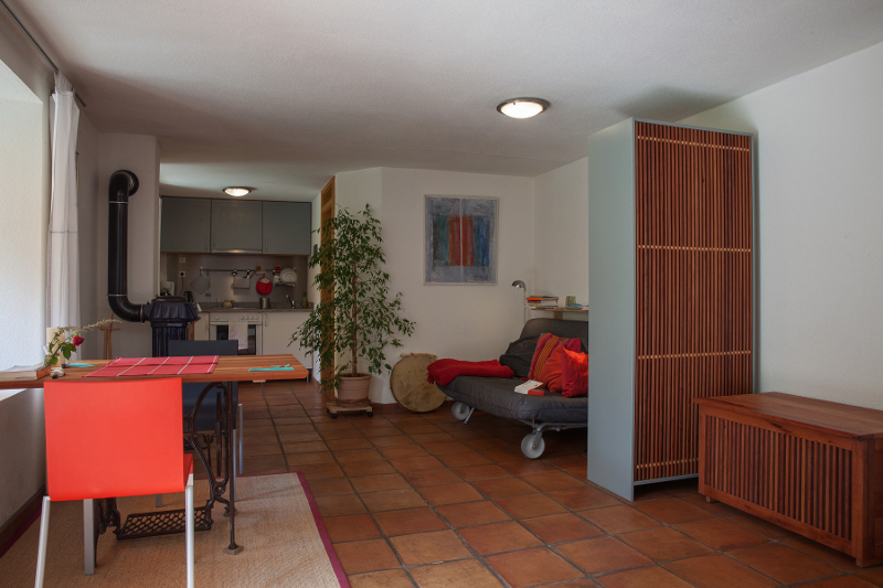 Das mit Natursteinen geflieste Appartement verfügt über eine Zentralfußbodenheizung und einen Kanonenofen, der wohlige Wärme spendet.