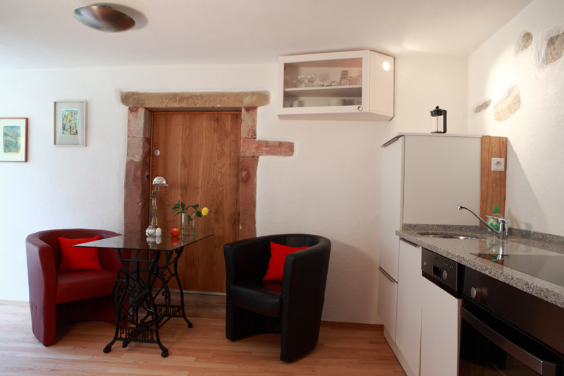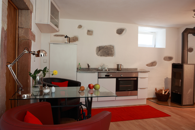 So sieht man in der Küche beispielsweise noch einzelne Steine des ursprünglichen Mauerwerks und an der Eingangstüre ziert der alte Sandstein den Rahmen.